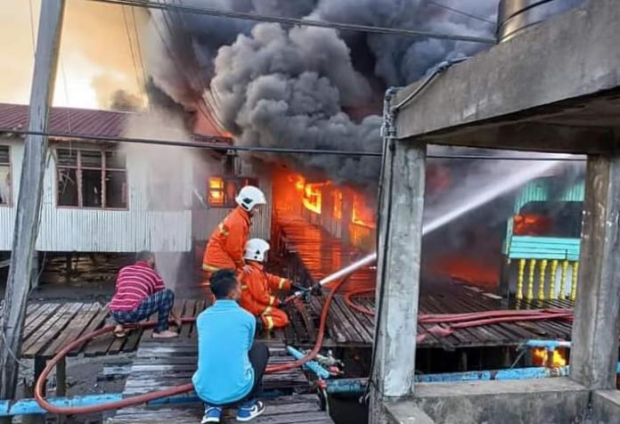 KUDAT: Kira-kira 179 buah rumah musnah dalam kebakaran di Kampung Landung Ayang, semalam.