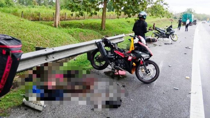 GURUN: Dua maut manakala beberapa penunggang motosikal cedera parah setelah dirempuh lori di Kilometer 92.8 Lebuhraya Utara Selatan (Plus) Arah Selatan, hari ini.