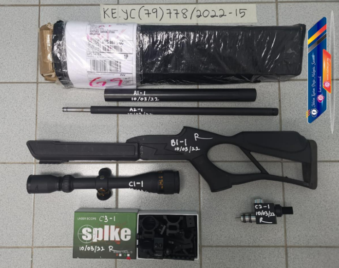 Hasil pemeriksaan lanjut di rumahnya telah membawa kepada penemuan dipercayai peralatan senjata, dua unit Hatsan Airtact Synthetic Stock, satu unit BSA Contender Riflescope Hunting Optics Sight, satu unit Airsoft High Pressure Indicator Ds Tm dan satu set Scope Extend Mount.